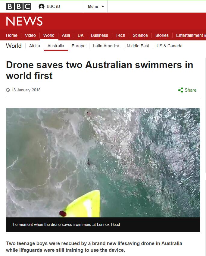 英國BBC報道澳大利亞首次使用無人機成功救援2名落海男孩