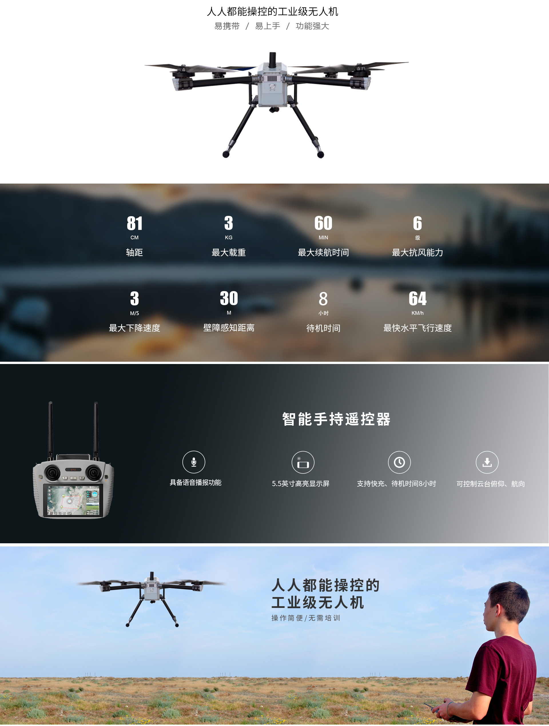 具備一鍵起飛、一鍵返航、一鍵降落、指點飛行等飛行功能,具有爬升、下降、水平加/減速等可調功能。