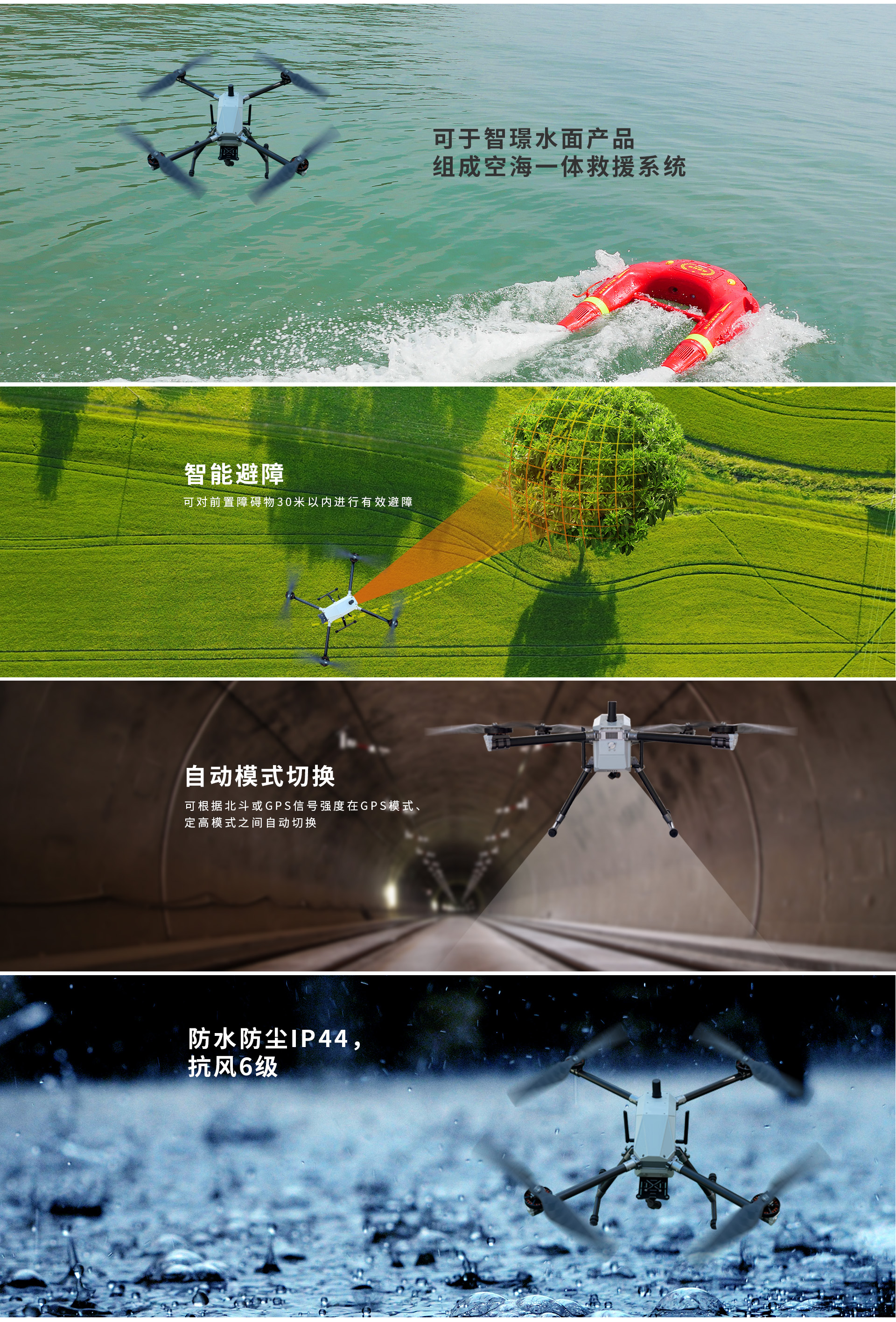 空海一體功能(選配):可與水上救援機器人、水上救生擔架等水面救生產品組成空海一體救援系統,無人機可以引領水上面救生產品跟隨航行、也可以切換中繼方式遠程控制水上救生產品。雙鋰聚合物電池快拆設計,總容量≤28000mAh。1、 遙控器具備遙控及地面站功能,包含安卓系統及相應APP功能;