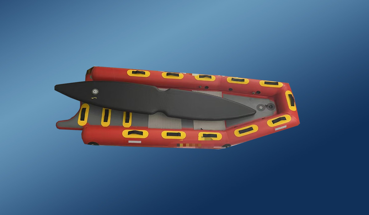 充氣底板前端為帶有EVA凹凸表面防滑區(qū)域;充氣底板后端帶有U型尾端